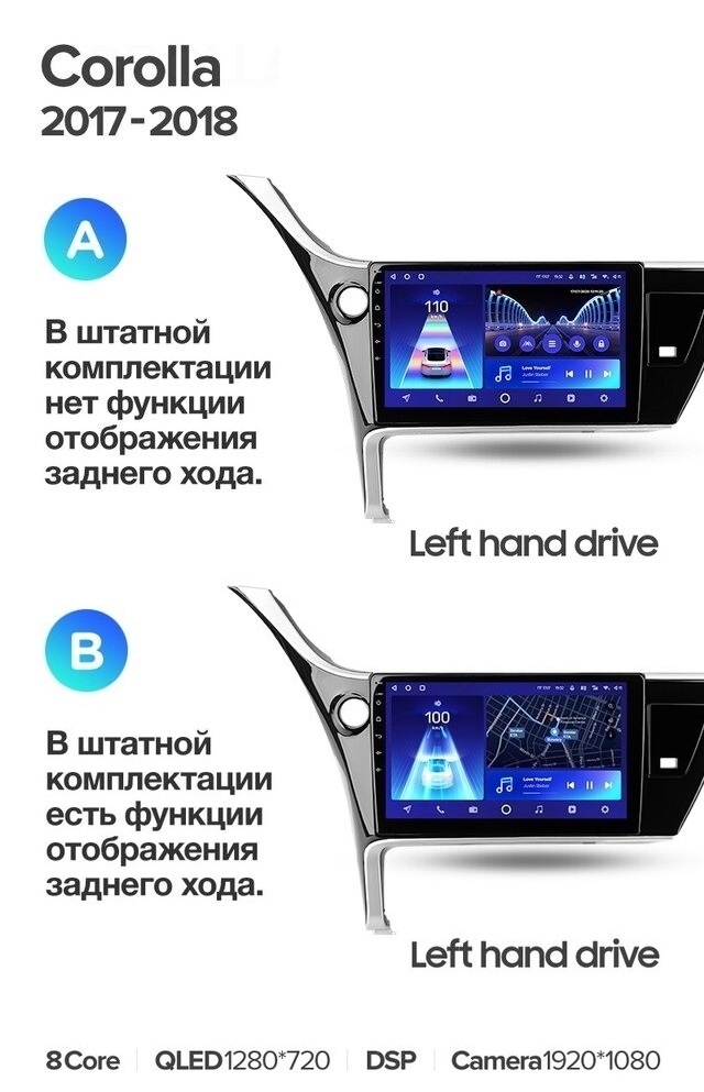 Полный комплект установки магнитолы Teyes с рамкой и проводкой можно выбрать в каталоге штатных магнитол Toyota Corolla (2017-2018).